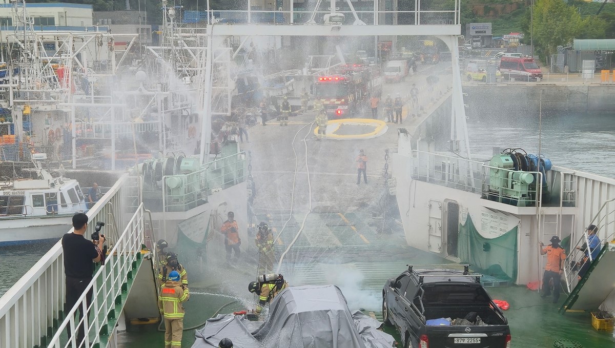 올해 추석은 개천절부터 한글날까지 이어지는 7일간의 최장 황금연휴로, 차량 선적이 가능한 주요 관광 항로 카페리 선박의 예약은 일찌감치 마감되는 등 뱃길 수요가 크게 늘고 있다. 이에 한국해양교통안전공단(KOMSA·이사장 김준석)은 추석을 한 달여 앞둔 지난 2일(화), 충남 보령시 대천항 인근 신한고속훼리호(344톤급, 여객정원 272명)에서 여객선 전기차 화재 대응 합동훈련을 실시했다.